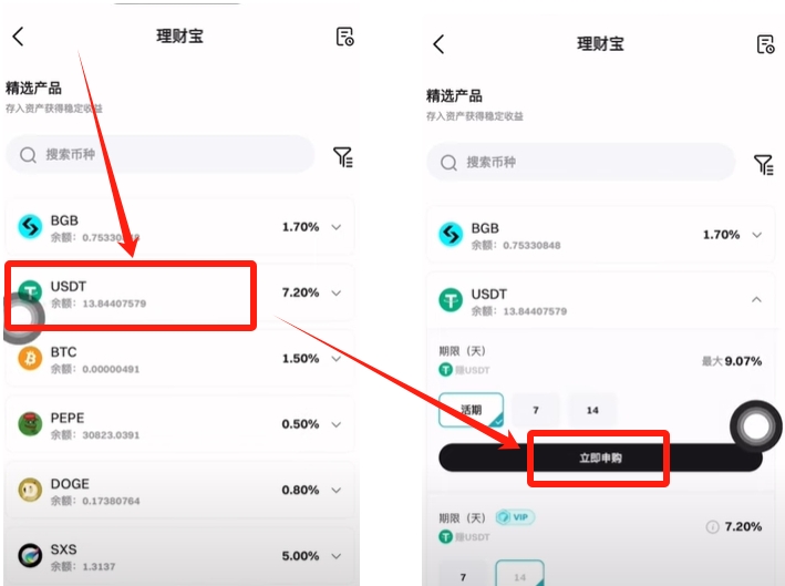 可以看到这里的币种还是比较多的。我们如果要买一个保本理财的话,就尽量选择一个稳定币,比如说USDT。因为这个币它的价格是跟美金的汇率挂钩的,所以它是不会大起大落,它是个稳定标。点击【立即申购】。