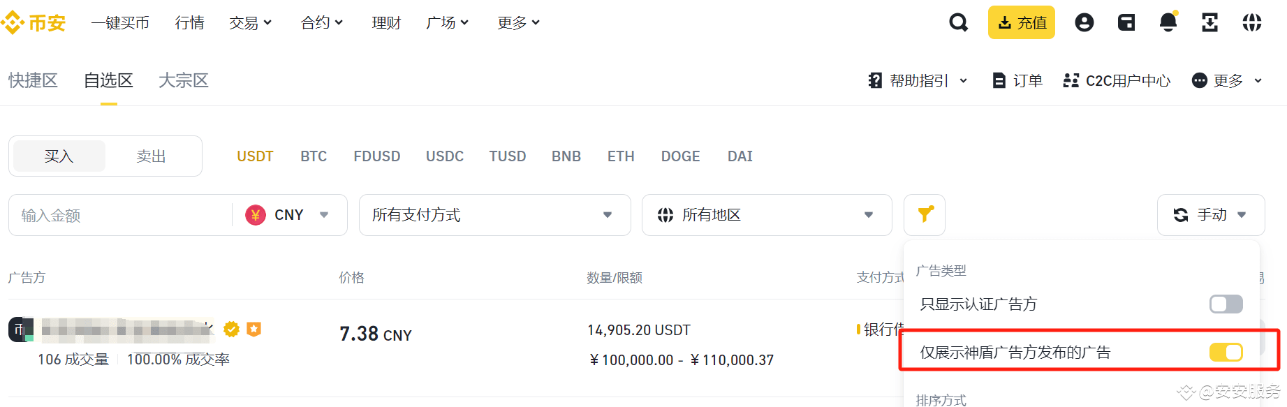 币安C2C平台在交易中采用了第三方托管服务,保障了用户交易的完整性,确保每笔交易中加密资产的安全性和资金到账的及时性。同时,币安C2C对商家采用严选模式,采取定期筛选、优胜劣汰的考核机制,从源头上最大程度杜绝不良商家的入驻。