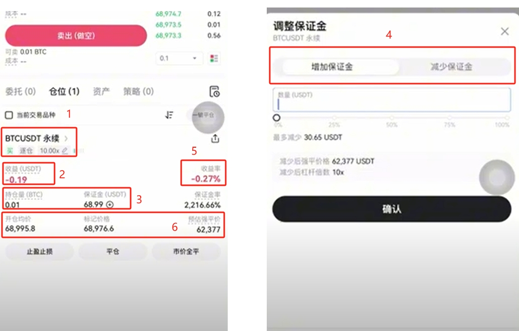 “持仓量”、“保证金”,保证金后面有一个小加号点击一下,你可以在这里增加保证金,你也可以减少保证金。比如说你右方这里的收益率已经-95%了,在爆仓的边缘。但是你觉得后续它会涨。那么你可以增加你的保证金。不让这个单子爆掉。还有“开仓均价”、“标记价格”、“预估强评价”,预估强评价就是一个预估的爆仓的价格。