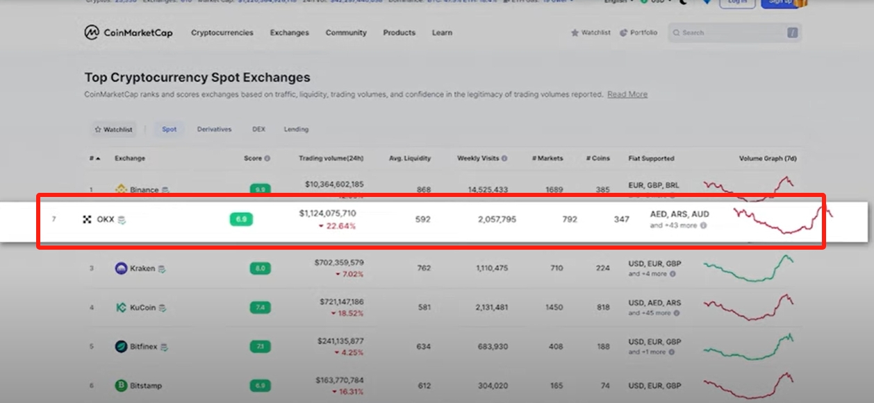 我们可以从CoinMarketCAP这个数据来看,你会发现其他现货交易量是处于第7左右,也就是前10的地位。