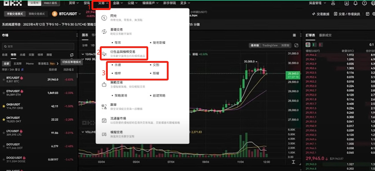 假设说我们现在想要玩衍生品,也就是合约交易的话,我们可以回到上方这里,点击【交易】,在衍生品这个选项,你会发现有永续、交割、杠杆、期权四种选项。“永续合约”是币圈的特殊产品,我们等下会介绍。“交割”就是传统季度合约。“杠杆”就是有点类似借贷交易,你可以将杠杆交易买到的加密货币,转到现货账户去做其他的操作。“期权”就是传统金融的选择权。