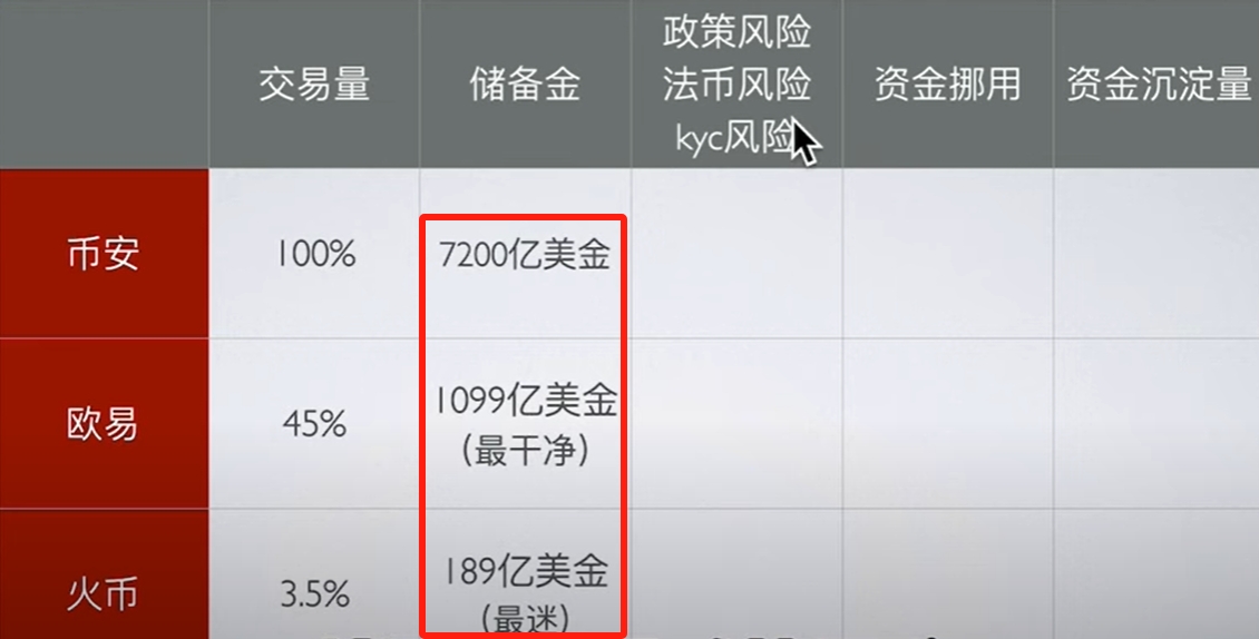 所以我们在储备金这一栏里面也可以写上,币安7200亿美金,欧易是1099亿美金,火币是189亿美金。