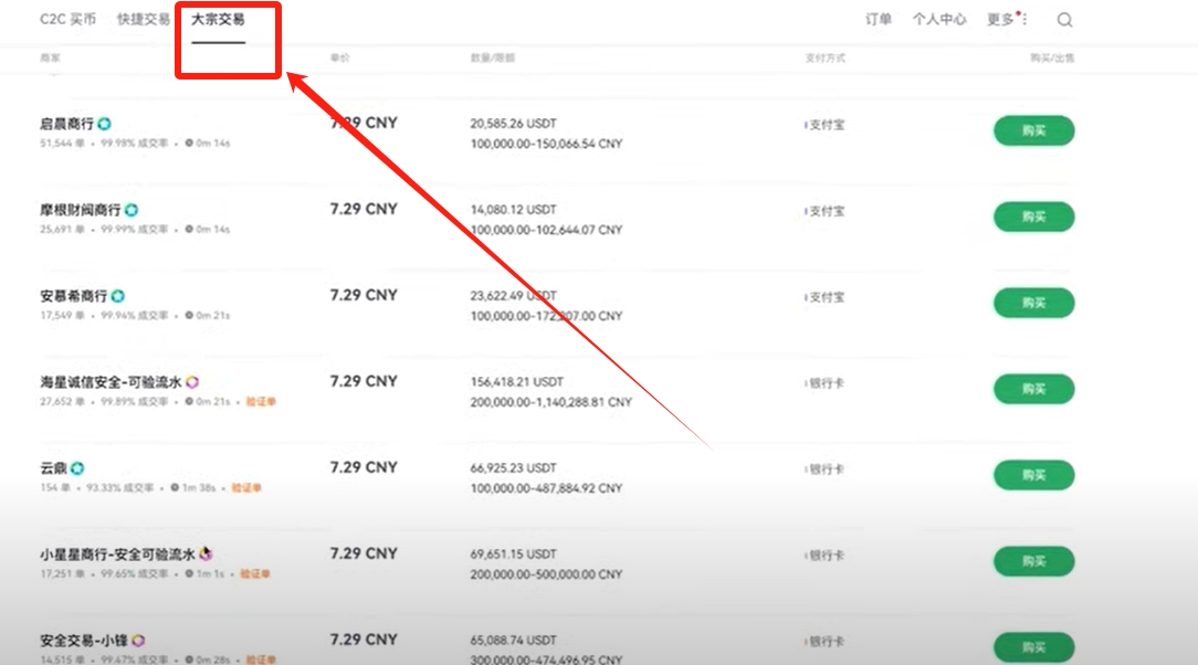 第二:需要找靠谱的大商家进行交易。特别是那些注册时间比较早,成交单数比较多的商家,并选择成交率在98%以上的。而且这些商家往往需要验证你资金,可能需要你付款渠道的近3天,或者是近3个月的交易记录,取决于下单之后彼此的沟通结果,所以一般需要查看你资金流水的商家,他们是希望能长期做OTC的商家,也会比较可靠一点。如果能找到粉红色标记的钻石商家,就不要选择带绿色标记的普通认证商家。普通的C2C买币区在列表偶尔会看到钻石商家,反倒是在大宗交易区比较常见一些。钻石商家向OKX缴纳的保证金比较多,比普通的认证商家更加可靠。