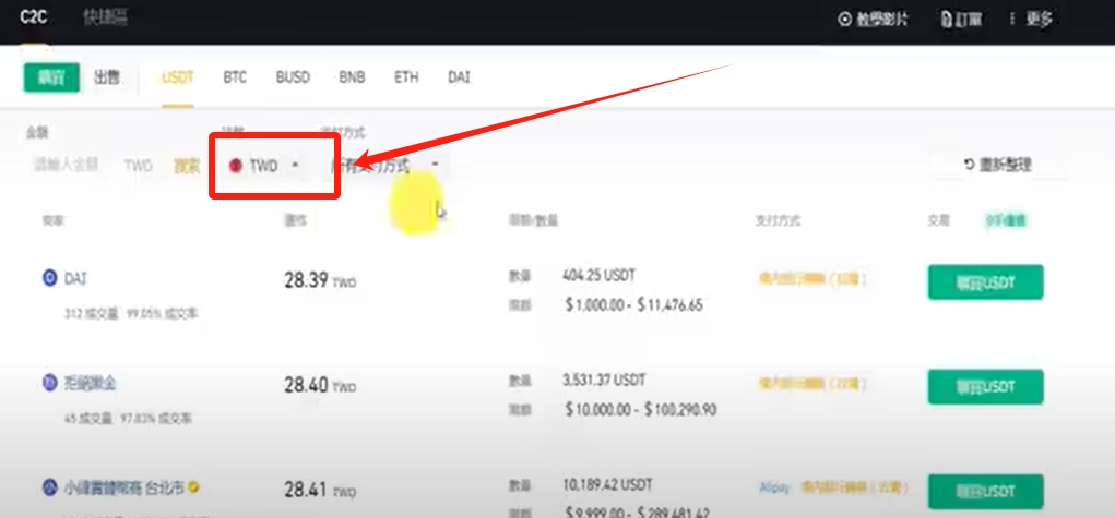 4.C2C买币,你可以在币安上面的C2C平台,使用各国法币去跟上面的商家买USDT。
