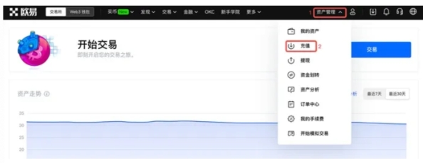 我们打开欧易交易所,点击右上角的【资产管理】,在里面找到【充值】。