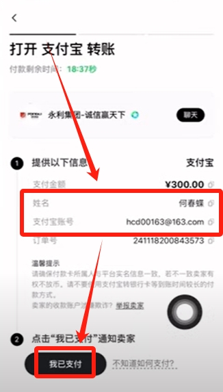 商家给我们发了一条消息,我们点击【聊天】看一下商家都输了什么,把这些相关的要求都看一下。其实他核心说的就是必须要使用你自己的账户来给他进行转账,而且不能提供任何造假的东西,总之就是不能进行任何违法的操作。我们就点击【 去付款】。