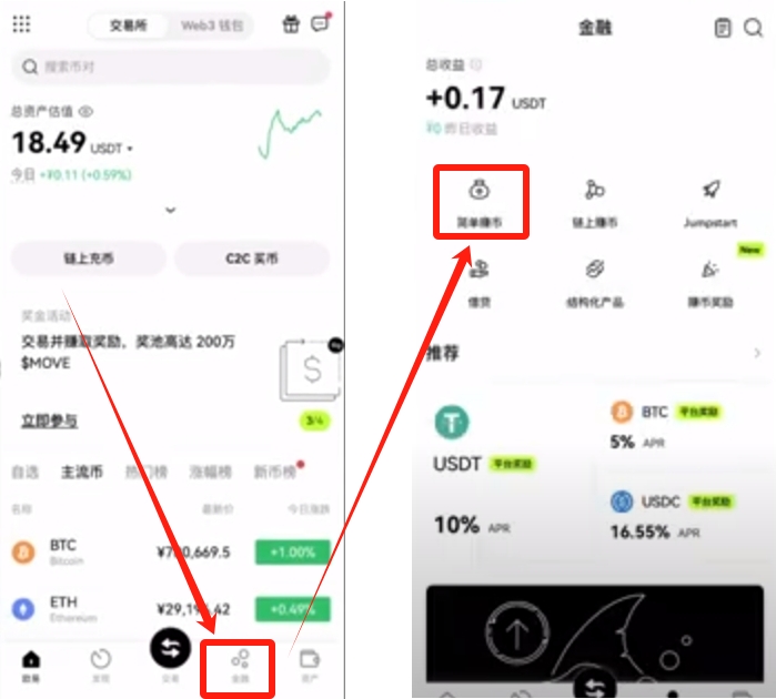 你要做的第一件事情就是打开欧易,这里我用手机来给大家演示。点击下方的【金融】,选择【简单赚币】。