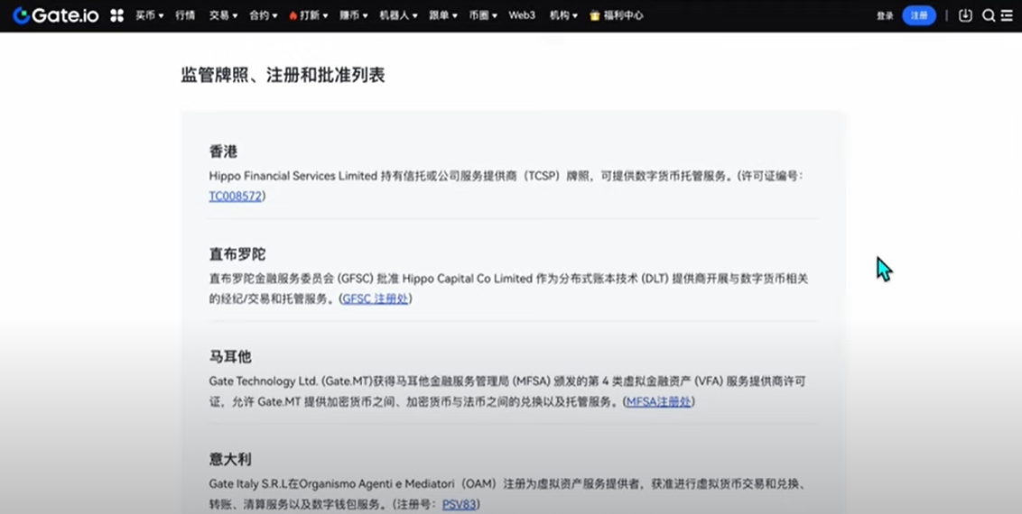 接下来我们再来对比一下这两者的牌照业务。首先我们来看一下gate交易所的牌照业务是怎么样的,一个交易所申请的牌照越多,就代表着他在合规方面的努力越强。如果他拥有一些好的牌照,他就不敢去作恶,因为一旦作恶了,这张牌照再续的时候可能就麻烦了。