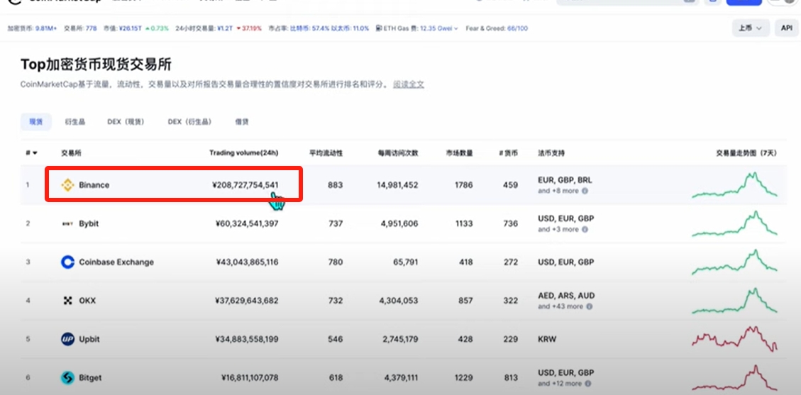 币安交易所稳坐全球交易量排名的第一,它24小时的交易量是2087亿,gate交易所是349亿。