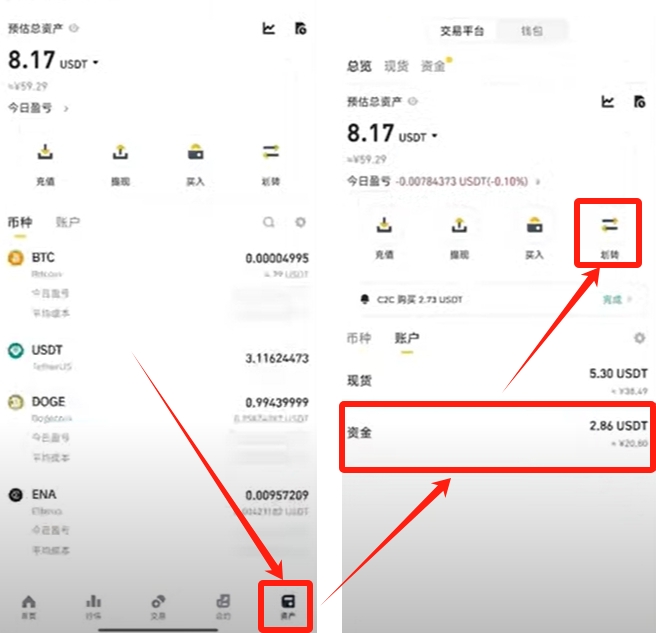 我们卖完之后还是要进行一波划转。点击右下角的【资产】,在上方点击【划转】。