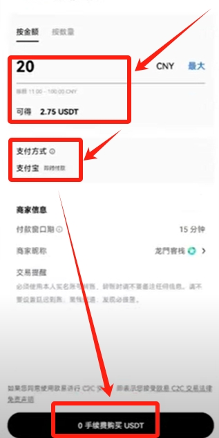 然后输入我们想要购买的金额,大家可以看到我花费20元人民币就可以购买2.74个USDT。支付方式就是支付宝即时付款,我们直接点击【0手续续费购买USDT】。