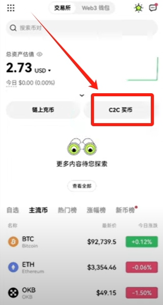 我们用人民币先去购买USDT,买成USDT之后,用USDT去购买BTC、以太坊或者你想购买的任何加密货币。我们直接点击主页的【C2C买币】。