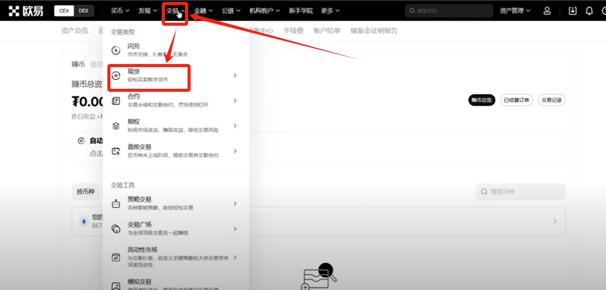 接下来我们就可以去购买各种加密货币了。我们点击上方这里的【交易】,选择【现货】。