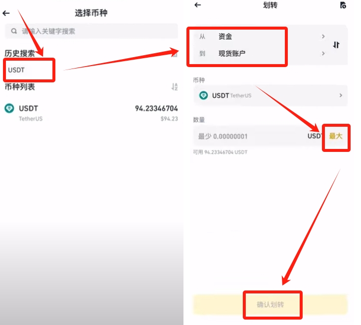 从现货账户到资金账户,币种我们选择USDT,数量最大,再点击确认。