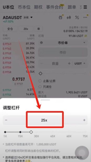 很多人的误解就来自于这个杠杆倍数,他会认为我这边比如说调成25倍的杠杆,那么我就必须使用25倍杠杆来进行下单。有些胆子小的人就会被杠杆吓到了,不敢再交易合约了。有的赌徒他就会每次都下25倍杠杆的单子,觉得这样很刺激。