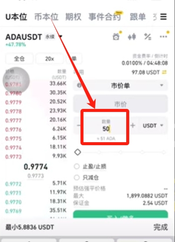 我们任意打开一个数字货币交易的合约交易界面,合约交易就是我们传统认为的期货,也就是future,在币圈它被称作合约。首先下单金额和下单数量在这里进行调节,本质上两者就是及对外展示的不一样,一个是我要开多骚颗ADA的仓位,一个是我要开价值多少美元的ADA的仓位。