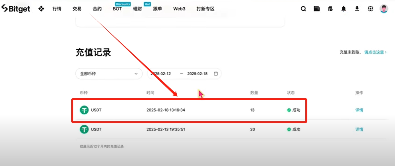 可以看到我们正在发送13个USDT,预计两分钟内到账。我们稍等一下,然后去bitget里面去查看有没有到账。