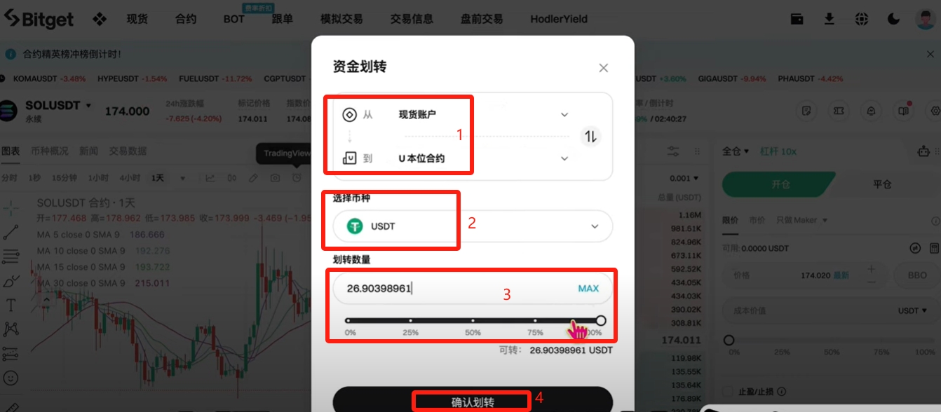 从现货账户给他划转到U本位合约,币种选择USDT,全部划转,点击【确认划转】。