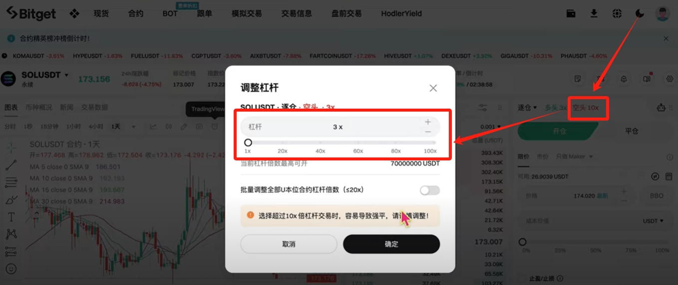 然后在后面你可以看到有多头10X和空投10X,这个就是杠杆。杠杆我们是可以去调的,最高可以开到100倍的杠杆,当然高杠杠就代表着高风险,所以我基本上都会选择5倍以下,基本上就是3倍到4倍。那我这个多头的杠杆就设置为3倍了。