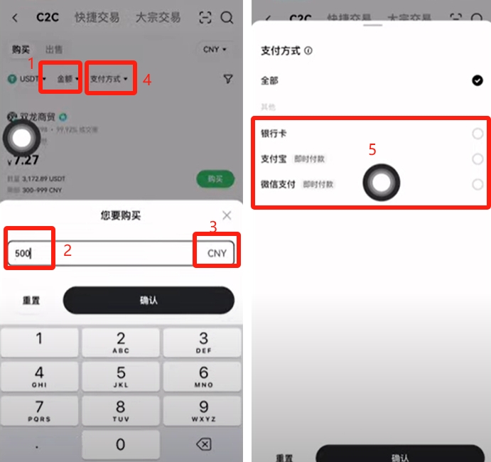 选择完币种之后,在金额这里来输入一下我们想要购买的金额,比如说500人民币,后面的CNY就是人民币的意思。然后再选择一下支付方式,它有三种支付方式,分别是银行卡、支付宝还有微信支付,你习惯使用哪种方式支付就使用哪种方式支付。