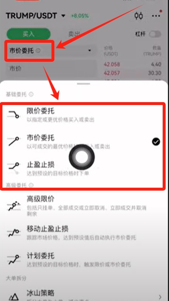 点击【买入】,然后在市价委托这里你可以看到有限价委托、市价委托、还有止盈止损。