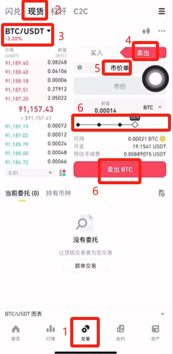 如果你要出金就是把整个过程反过来,把你所持有的比特币给他卖出换成USDT。还是点击下方中间的【交易】按钮,上方选择【现货】,还是选择“BTC/USDT”的交易对。选择【卖出】,还是选择市价单,因为他会快速成交。数量拉满,全部进行卖出,点击【卖出BTC】。