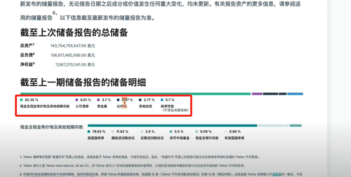 在这个报告里面你能够看到Tether发行USDT之后,背后备兑的资金有哪些。首先83%就是现金或者是现金等价物,剩下的大头还有一些贵金属,比如说黄金,他还会持有一定的比特币以及做一些其他的投资。所以它的一个整体的一个投资部位,风险敞口是 很小的,都是拿的这些市面上的一些硬通货。而且Tether公司作为发行最早的稳定币,在市面上的认可度也是非常高的,无论是交易所也好,还是钱包链上的业务也好都认可USDT。