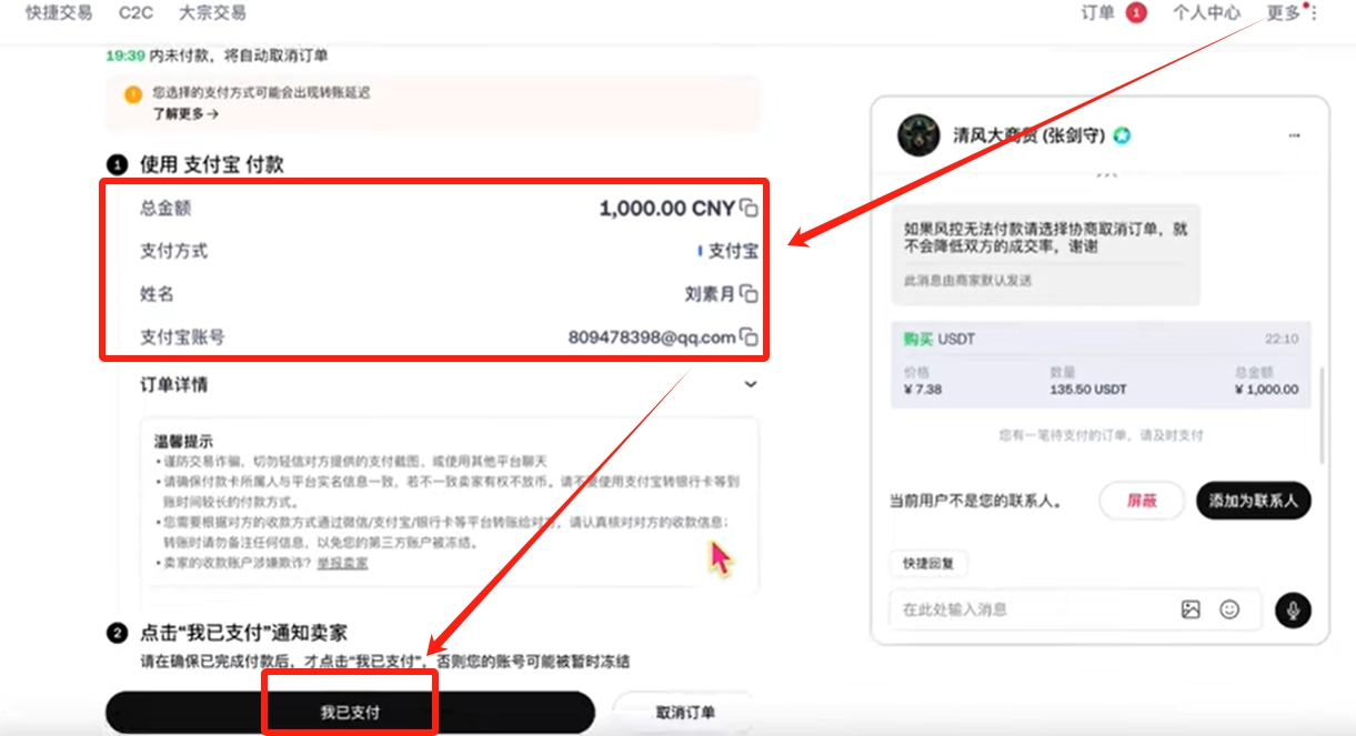 接下来我们根据商家提供的支付方式给他转钱,转完钱之后点击下方的【我已支付】,通知卖家。等待卖家核实收到钱之后就会把币打给我们了。