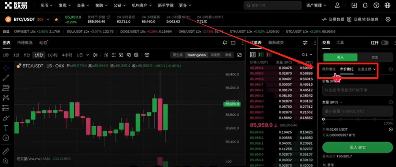 如果你现在就想购买我们可以选择”市价委托”。这个时候你会发现,市价委托价格这里不需要我们去输入价格,因为他会以当前市场最优惠的价格直接下单,我们输入要购买的金额或者是数量就可以购买成功。我们输入要购买的金额,点击【买入BTC】。