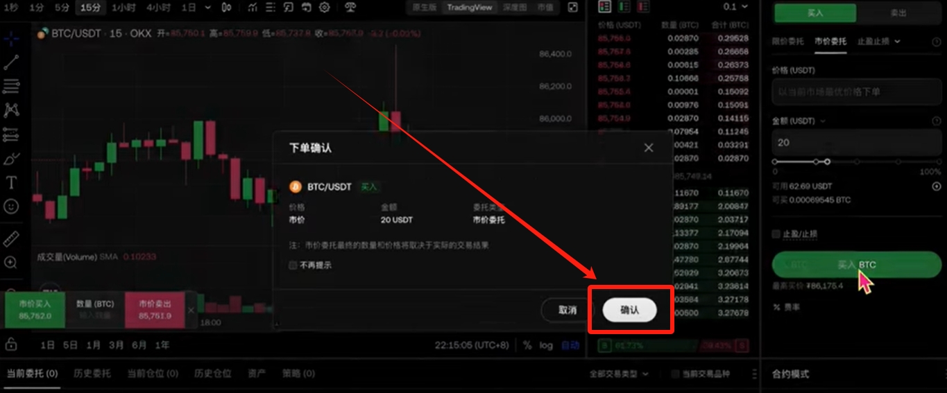 点击【确认】就下单成功了。现在我们就成功的够好比特币了。