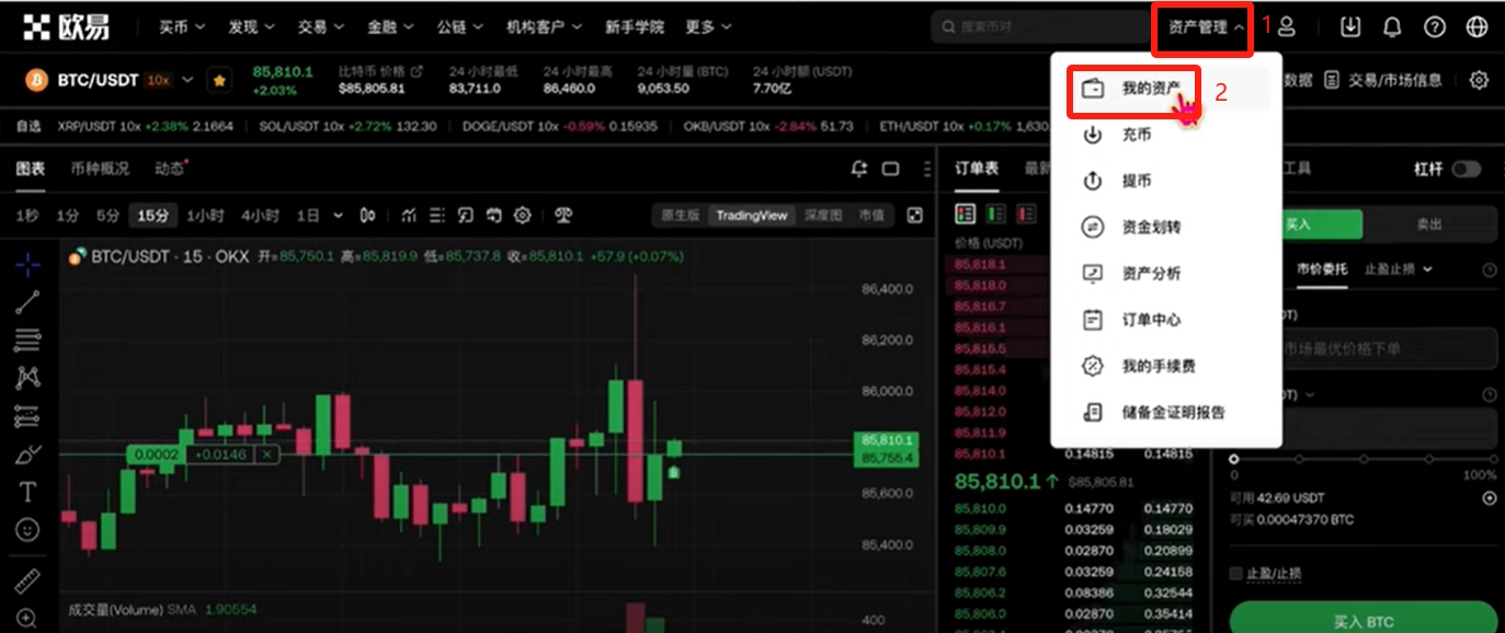 我们买完的USDT在哪里查看呢?点击上方的【资产管理】,选择【我的资产】。