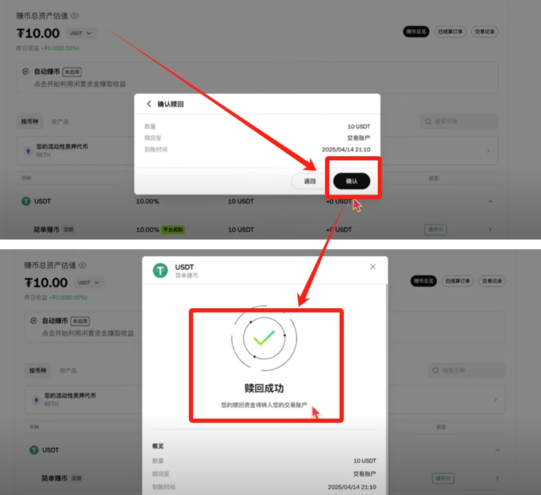 我们在金融账户里面,其实他用的就不是一个划转的操作了,他用的其实是一个购入和赎回的操作。比如说我想去赎回我的USDT,我就点击一下我这个产品。