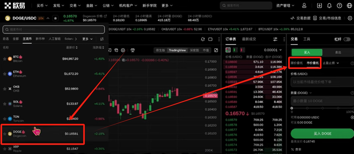 我们再来看一下需要注意的交易对,我现在用的这个稳定币是USDC,那么DOGE/USDC就可以理解为是用USDC去买DOGE。大部分人用的都是USDT,我们就可以选择使用DOGE/USDT。