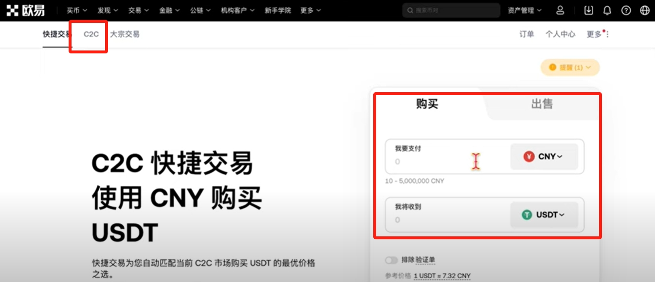 划转完成之后,我们点击上方的【买币】,选择【C2C买币】。