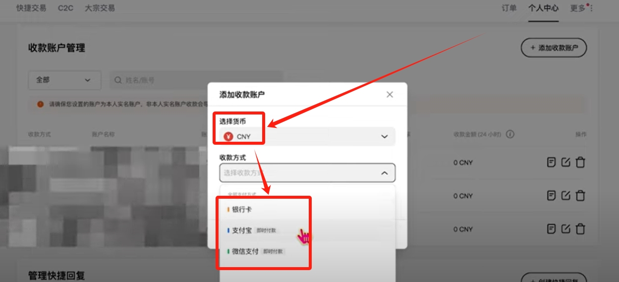 我们做完身份认证之后,就要去添加收款方式了。收付款的入口比较特殊,我们在C2C买币里面,点击右上角的“个人中心”。买币的时候就要去添加个人账户了,就在这里去添加收款账户。点击右上角的“添加收款账户”。
