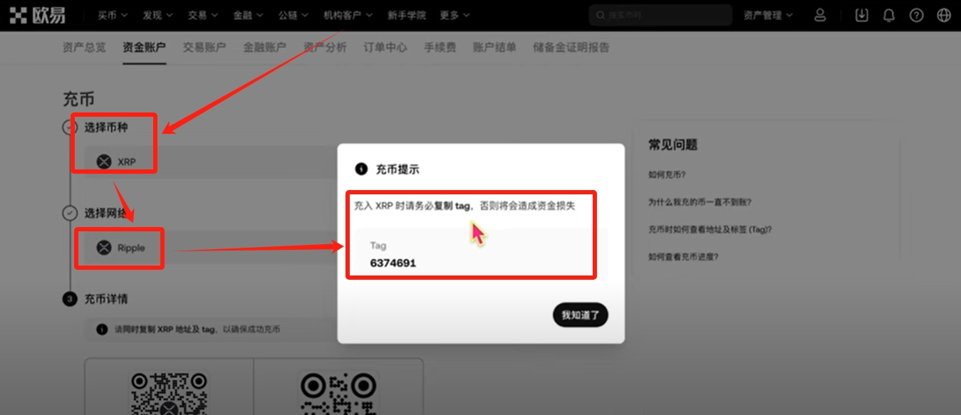 除此之外还有一些特殊的品种,比如说XRP。我们在充XRP的时候,用的网络都是ripple网络。这里面就会出现一个东西叫tag,所谓的tag指的是一串数字。你在其他地方提的时候也要同时输入地址,并且输入tag才能够把XRP由其他交易所提到欧易交易所里面来。这是充币的环节。