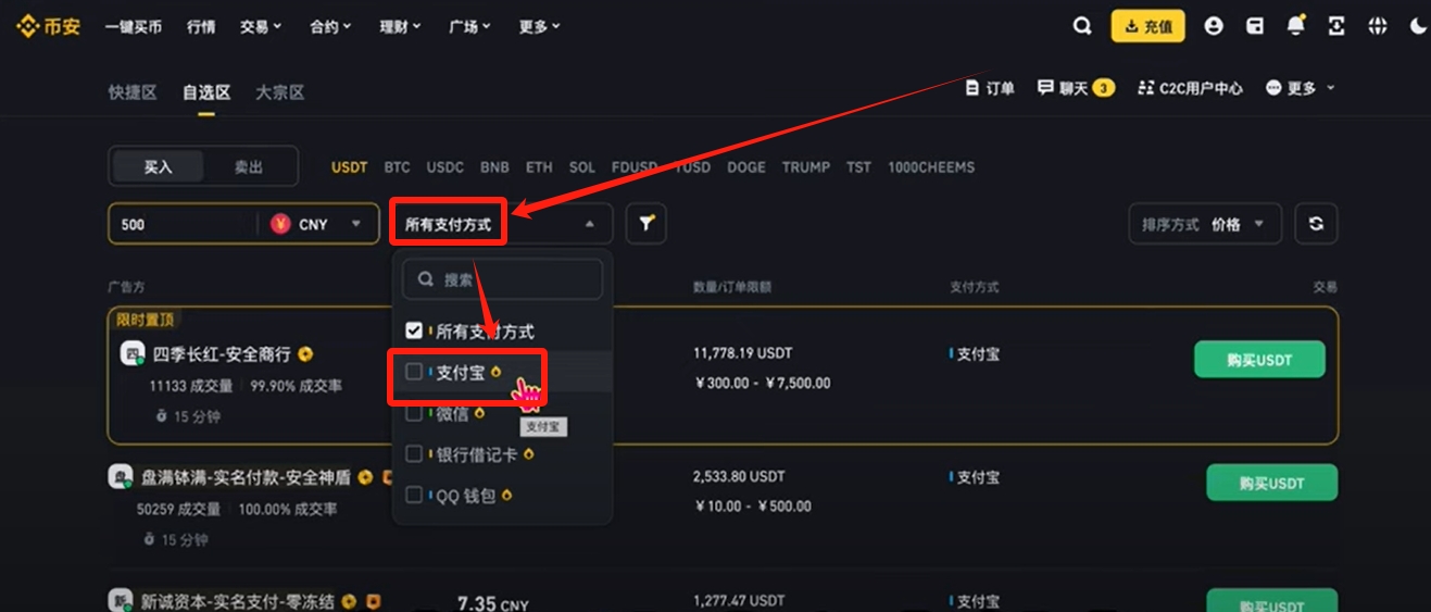 不同的是我们点击这里的【卖出】,币种还是选择USDT。你同样可以在这里筛选一下要交易的金额,然后在后面选择一下你的收款方式。