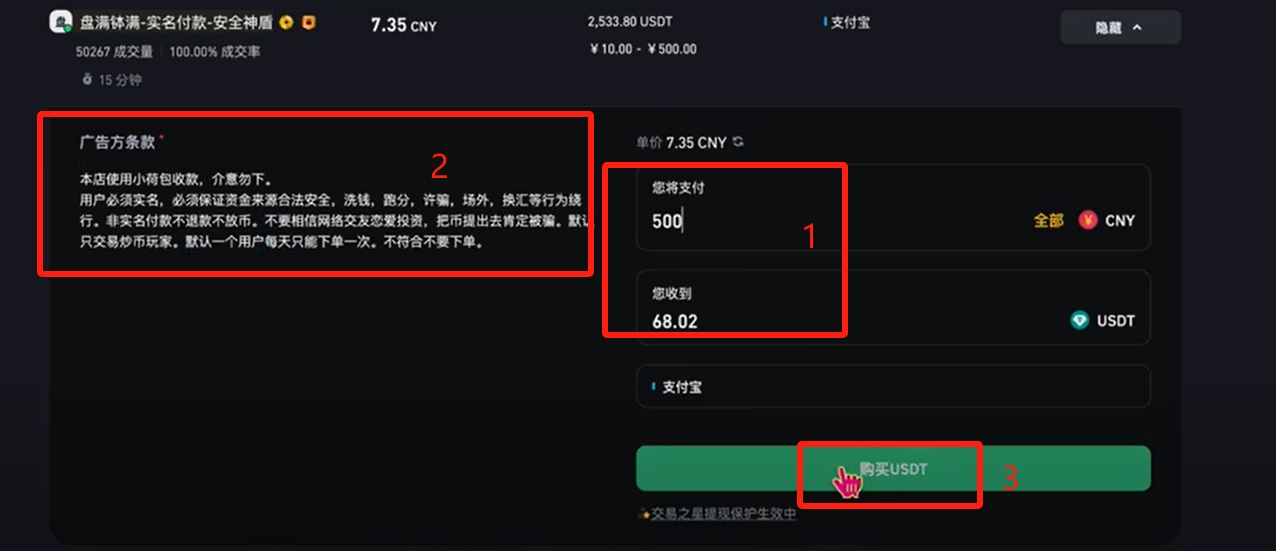 再次输入一下你要购买的金额,它会自动为我们算出来我们支付500人民币,将收到68.02颗USDT。我们在左侧这里可以看到商家的要求,他告诉我们用户必须实名,必须保证资金来源安全,而且非实名付款的话,它是不退款不放币的。我们直接点击【购买USDT】。