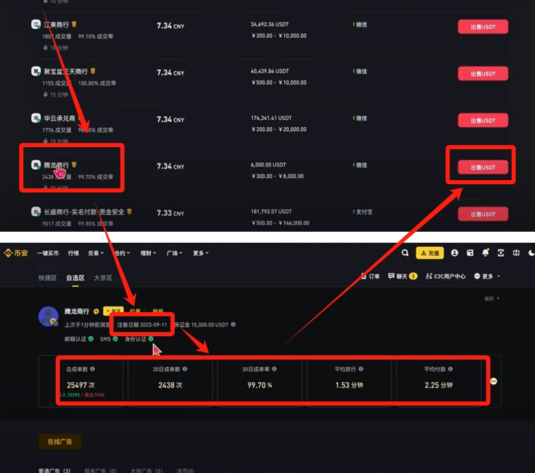 我们再来看一下“腾龙商行”这一家,这家的注册时间是在2023年9月11号,已经有一年半左右了。他的30日成交率在99%以上,而且他的平均放行时间是在1分53秒,平均付款时间是在2分25秒,这家就是可以进行出售的。点击【出售USDT】。