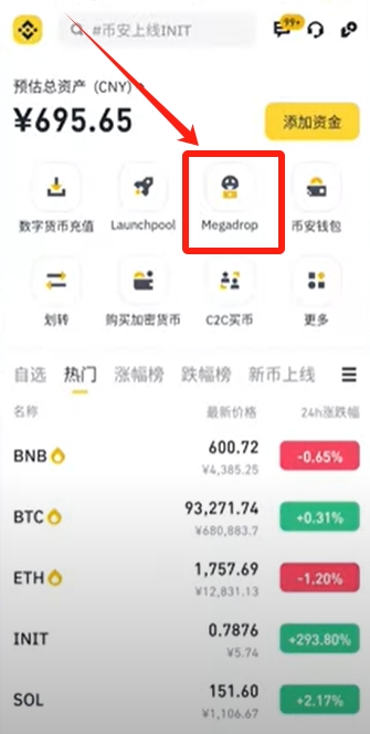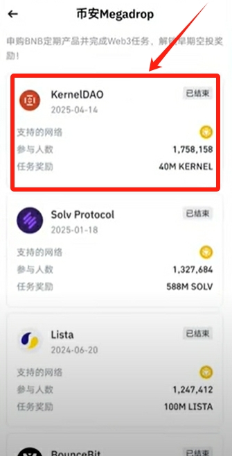 这里面就利用到了我们币安存定期来获得积分,就能够换算成空投的奖励了。我们仍旧在币安交易所里面找到Mega drop。