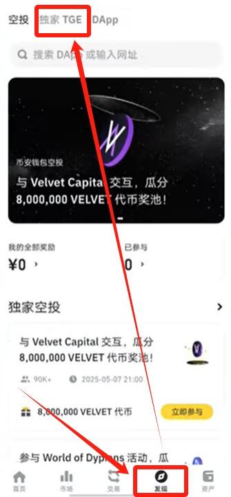 让你点击右下角的【发现】按钮,上面有一个“独家TGE”。