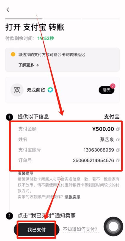 我们根据商家提供的支付方式给他转钱,转完钱之后点击【我已支付】,等待卖家核实收到钱之后,就会把币打给我们了。