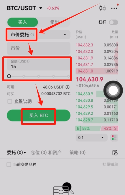 我们先来说一下限价委托。“限价委托”就是需要我们来报一个价,必须得跟这个价格差不多的时候才能够成交。比如现在的价格是104748,我们想以104000的价格来进行购买,你就可以在这里输入你想要购买的价格,然后输入你要购买的数量或者是金额,点击【买入BTC】就下单成功了。