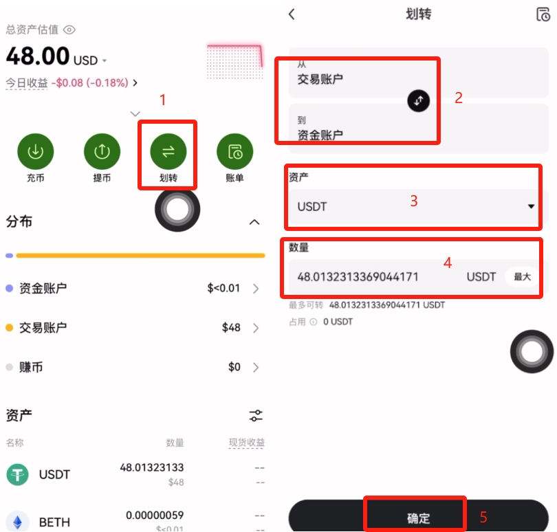 我们还是回到资产的页面再次进行划转,从交易账户到资金账户,币种选择USDT,全部划转,点击【确定】。因为只有资金账户才有支持变现的功能。