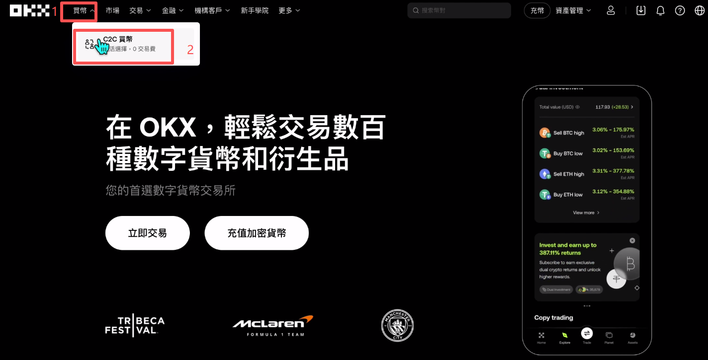 我现在所在的就是欧易的官网,我们在首页这里点击【买币】,选择【C2C买币】。