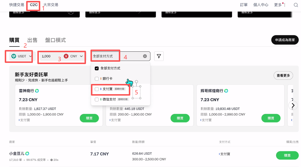 在下面购买的页面,币种这里我们就选择“USDT”。然后筛选一下我们想要购买的金额,比如说我这里想购买1000人民币的USDT。支付方式这里我们可以筛选一下,你是想用银行卡、支付宝还是微信支付,我这里就选择“支付宝”。