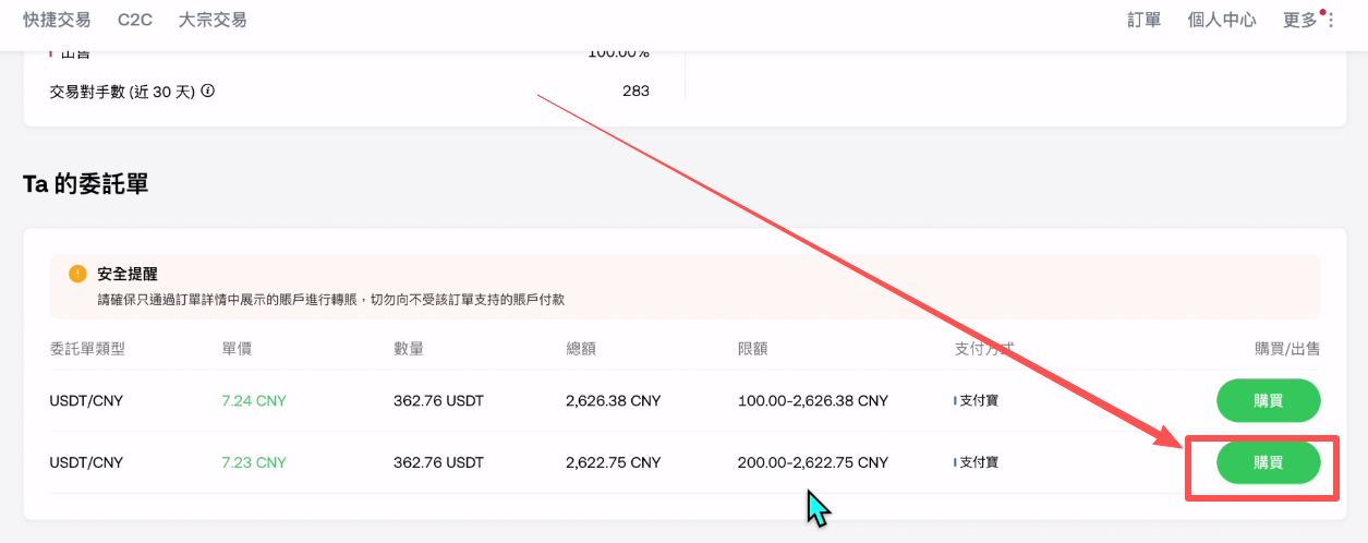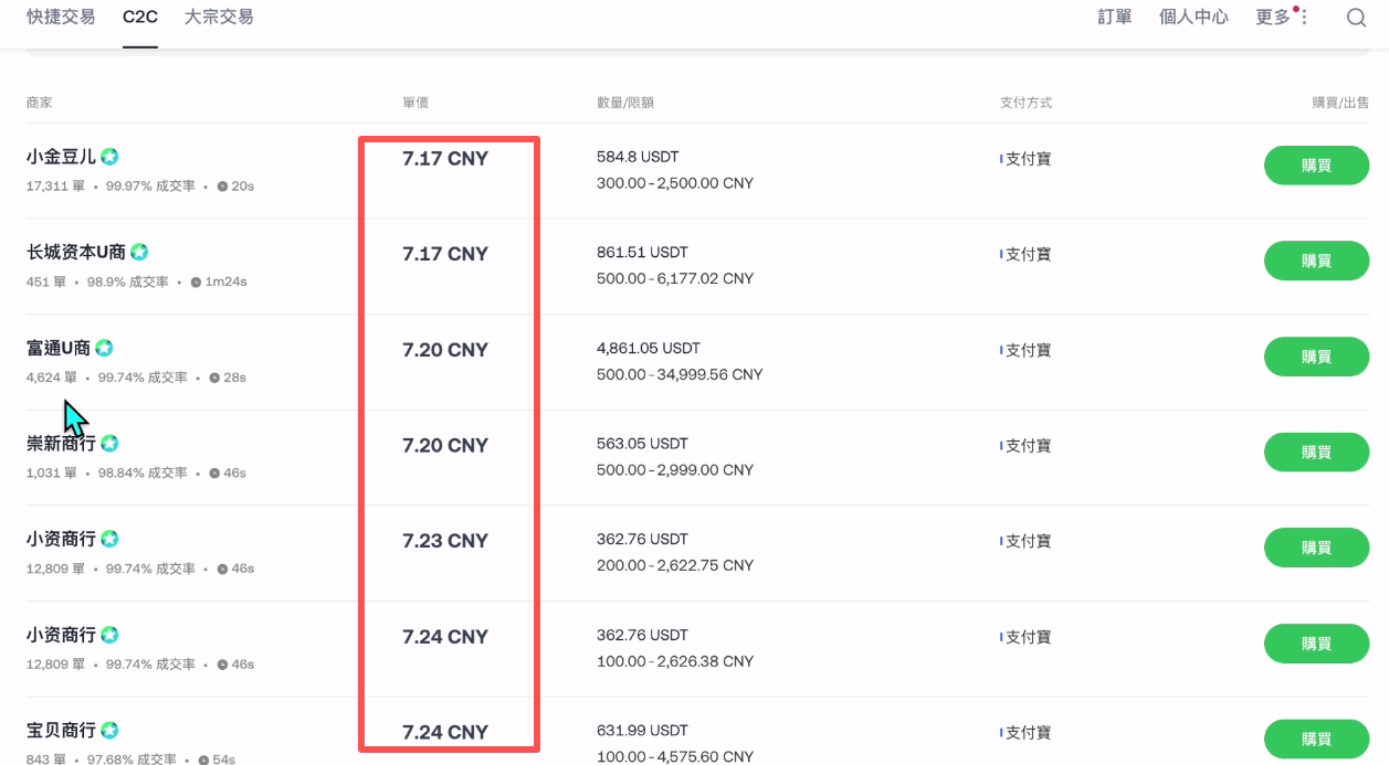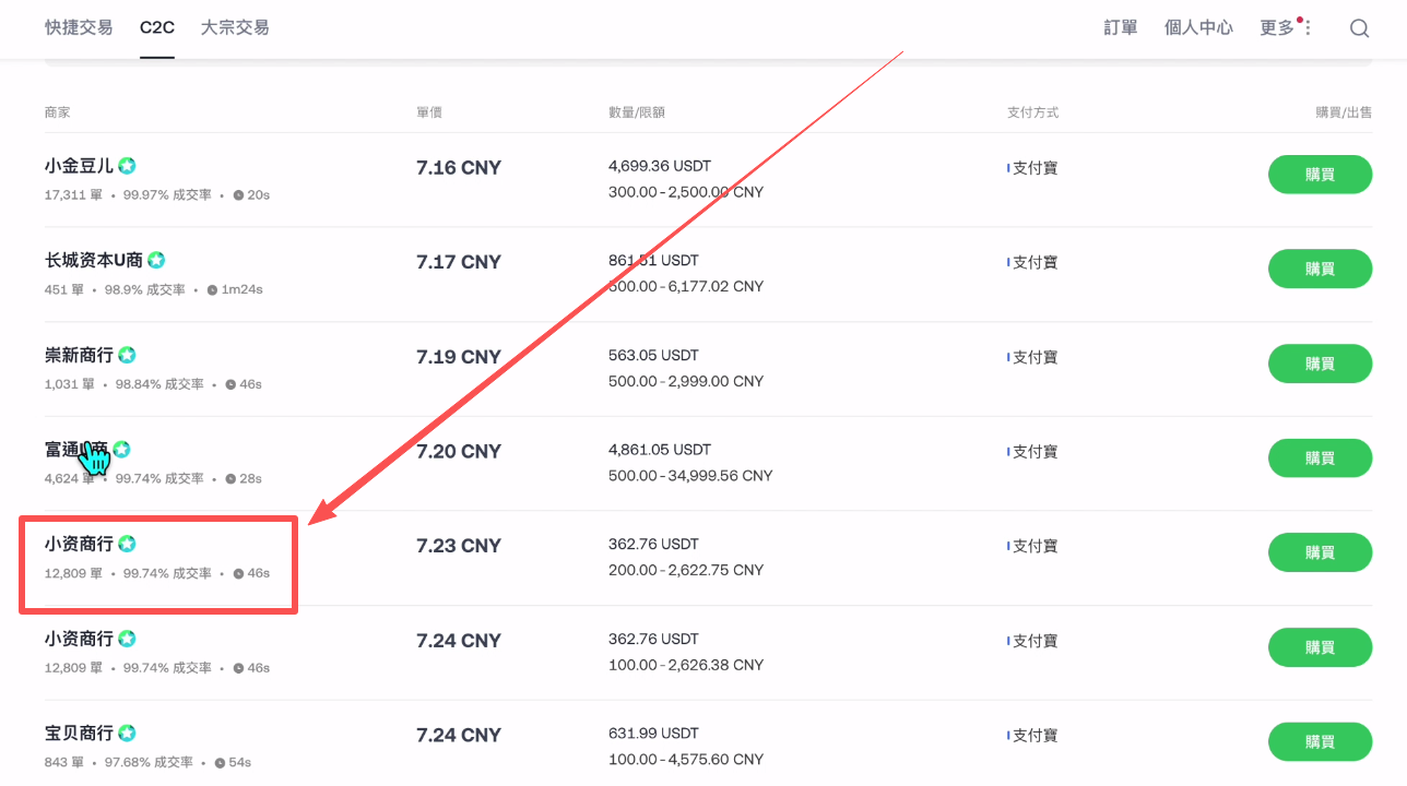 往下捯,我们找到他的委托单,注意看不同的单价它的限额也是不同的。当然如果我们想要买1000人民币的USDT,我们直接使用这个最低的单价就可以了。点击【购买】。