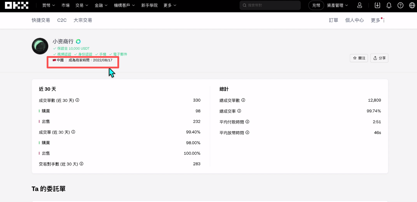 可以看到他这里显示的是22年的8月份,距离现在已经三年多了,我们就要找这种注册时间比较久的商家,至少也要是半年以上的。因为他的账户存活的时间越久,就证明他的资产越安全,这么长时间交易以来,没有出过什么事情,我们就可以去选择跟他交易。