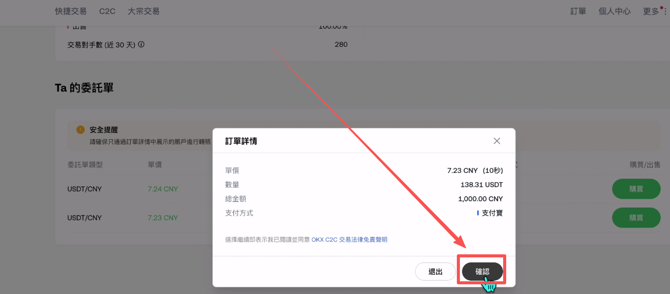 这个时候我们的订单就生成了,如果你在交易的过程中出现了什么问题,你可以在右边这里去和卖家进行私聊,没有问题我们看左边这里他的姓名还有支付宝账号,都已经给我们显示出来了。这时候就需要我们离开平台去到支付宝里面,根据卖家给我们提供的他的姓名和账号去给他转账了。转账完成之后点击【我已支付,通知卖家】,把我们的付款截图发给他,他那边确认了之后就会把币从平台放给我们了,这样我们就完成了入金的流程。买完USDT之后,我们就可以用它去兑换其他的加密货币了。