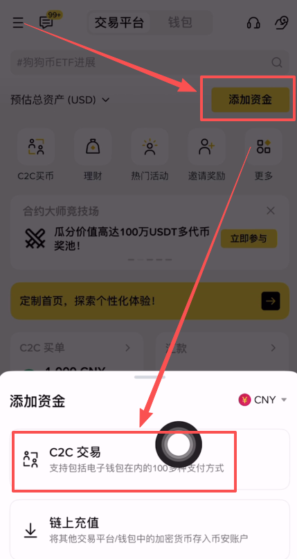 点击首页上方的【添加资金】,选择【C2C交易】。